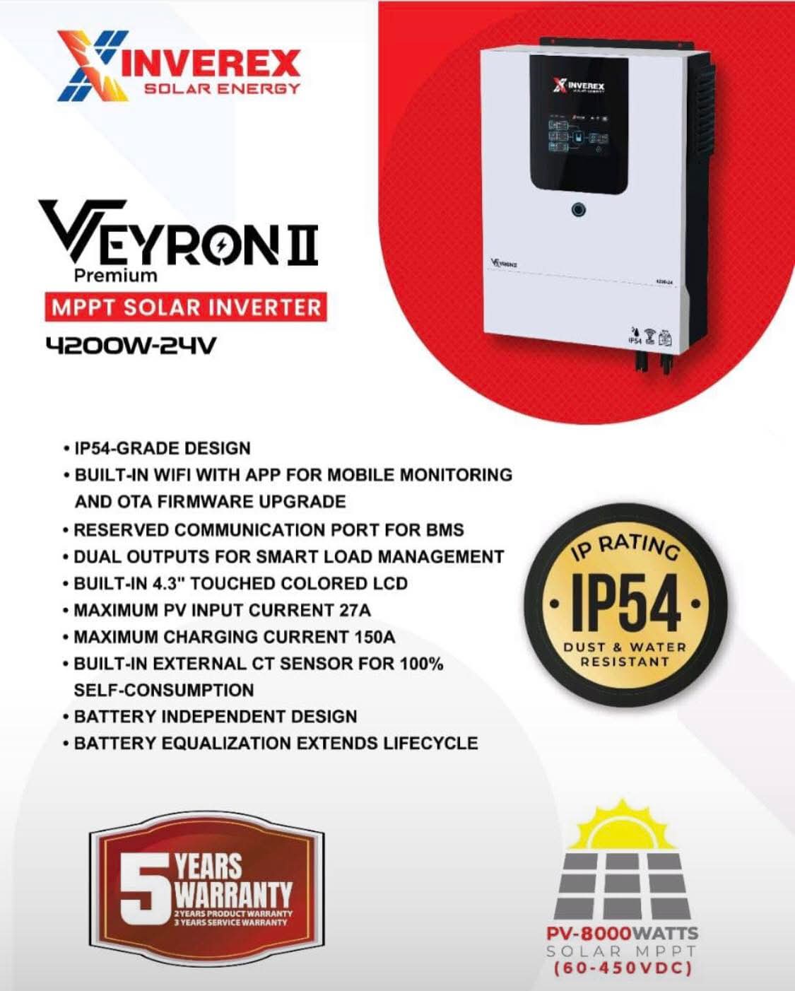 The INVEREX VEYRON II 4KW-24V MPPT Solar Inverter is an advanced and versatile inverter designed to deliver efficient solar energy conversion with modern features, making it ideal for both grid-tied and off-grid applications.