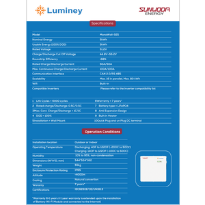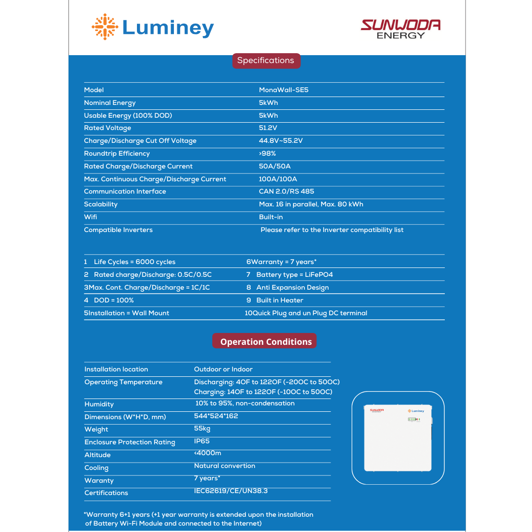 The Luminey MonaWall SE5 is a robust energy storage solution, offering high efficiency, long life, and smart monitoring capabilities, making it ideal for off-grid and hybrid solar systems.