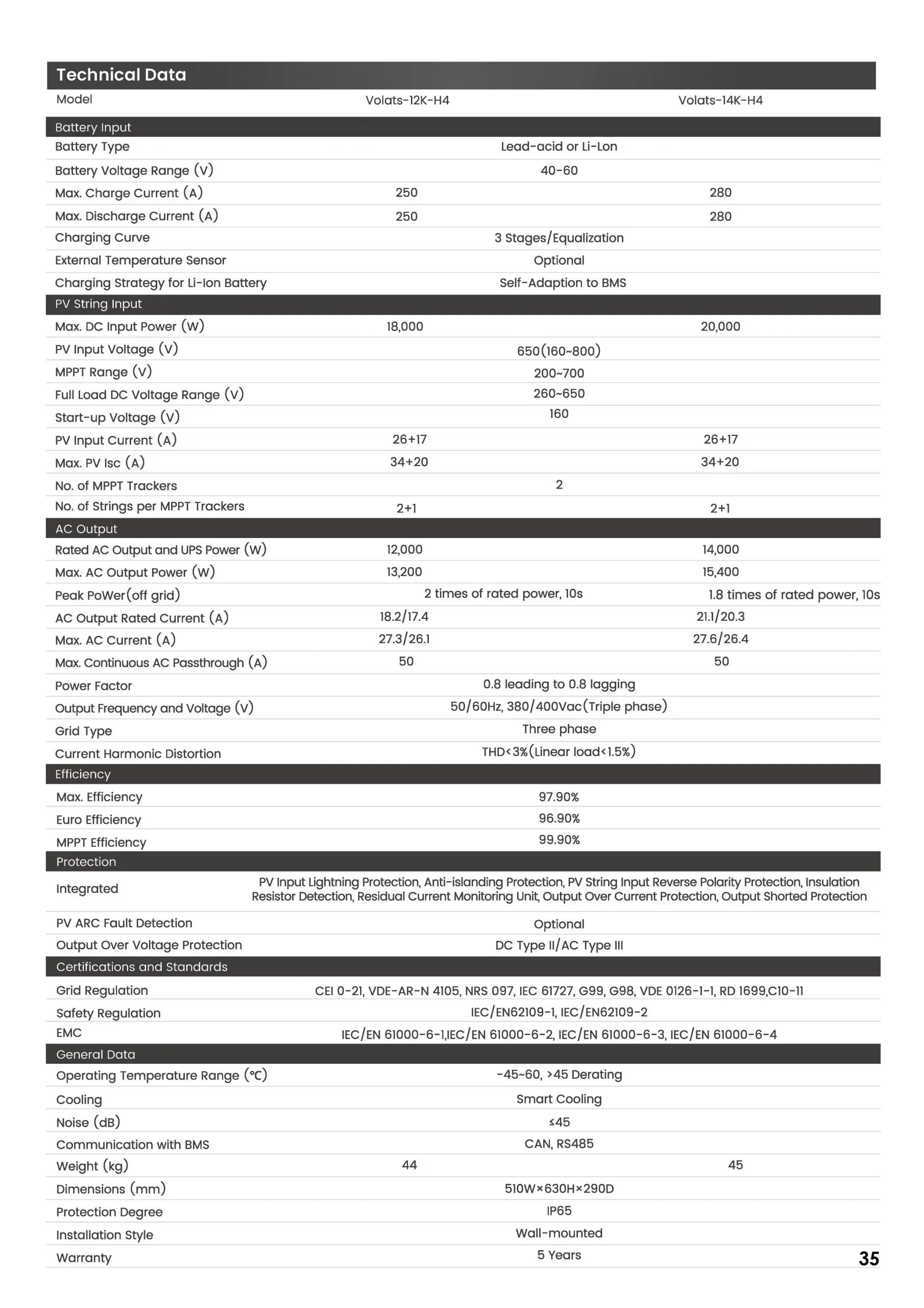 MaxPower Voltas 14K-H4 PV20,000 14KW IP65 Three Phase Hybrid Inverter