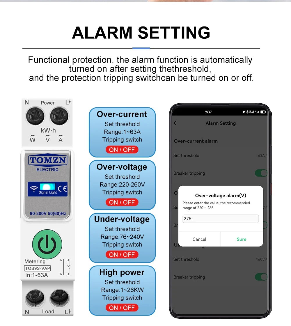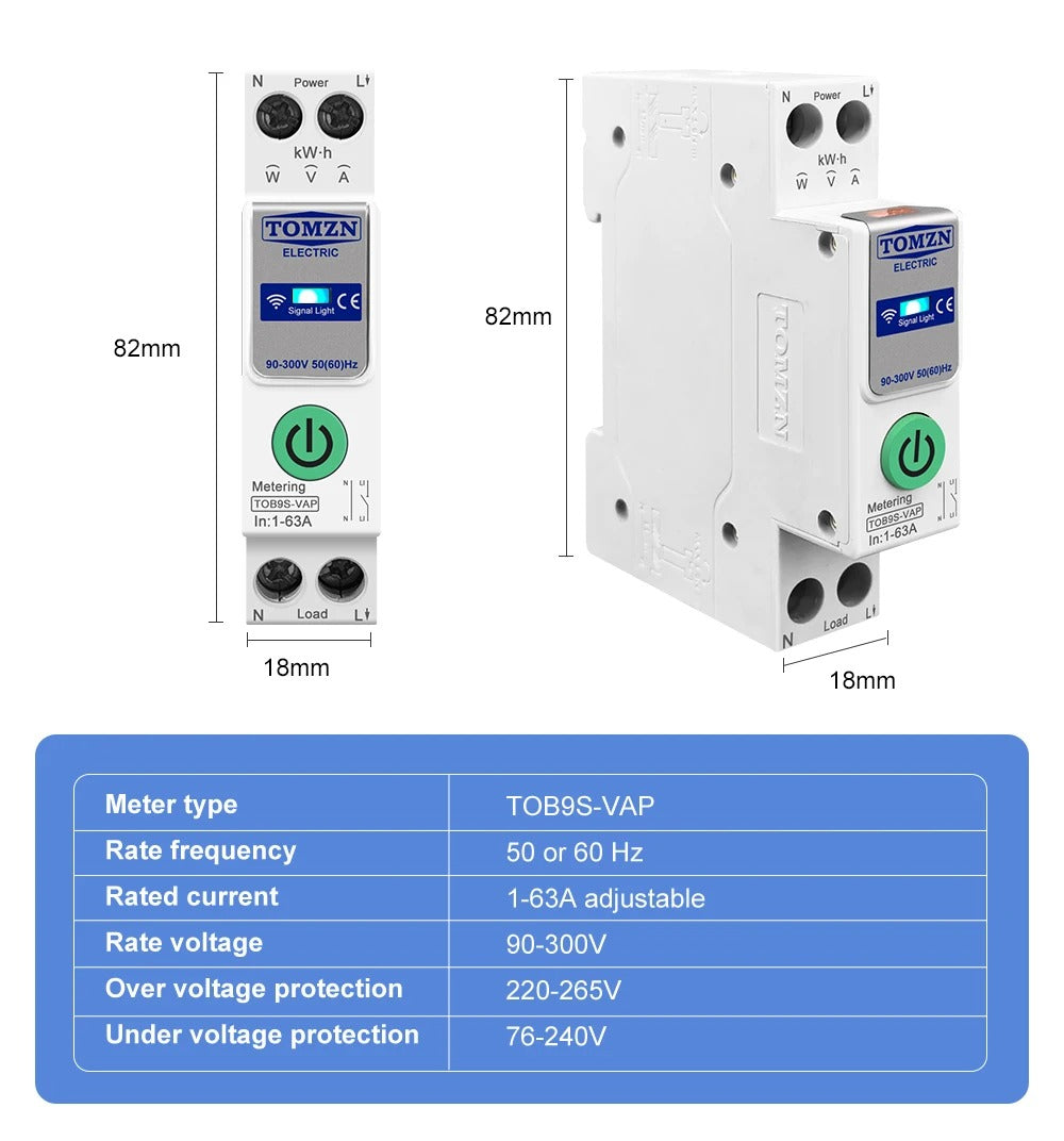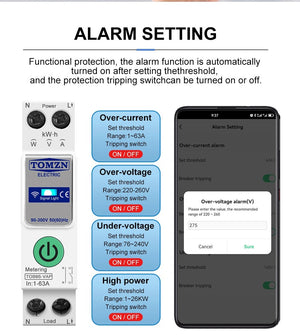 Tomzn TOB9S-VAP 8in1 63A WIFI Smart Switch with monitoring and Protection, TOMZN wifi breaker full function