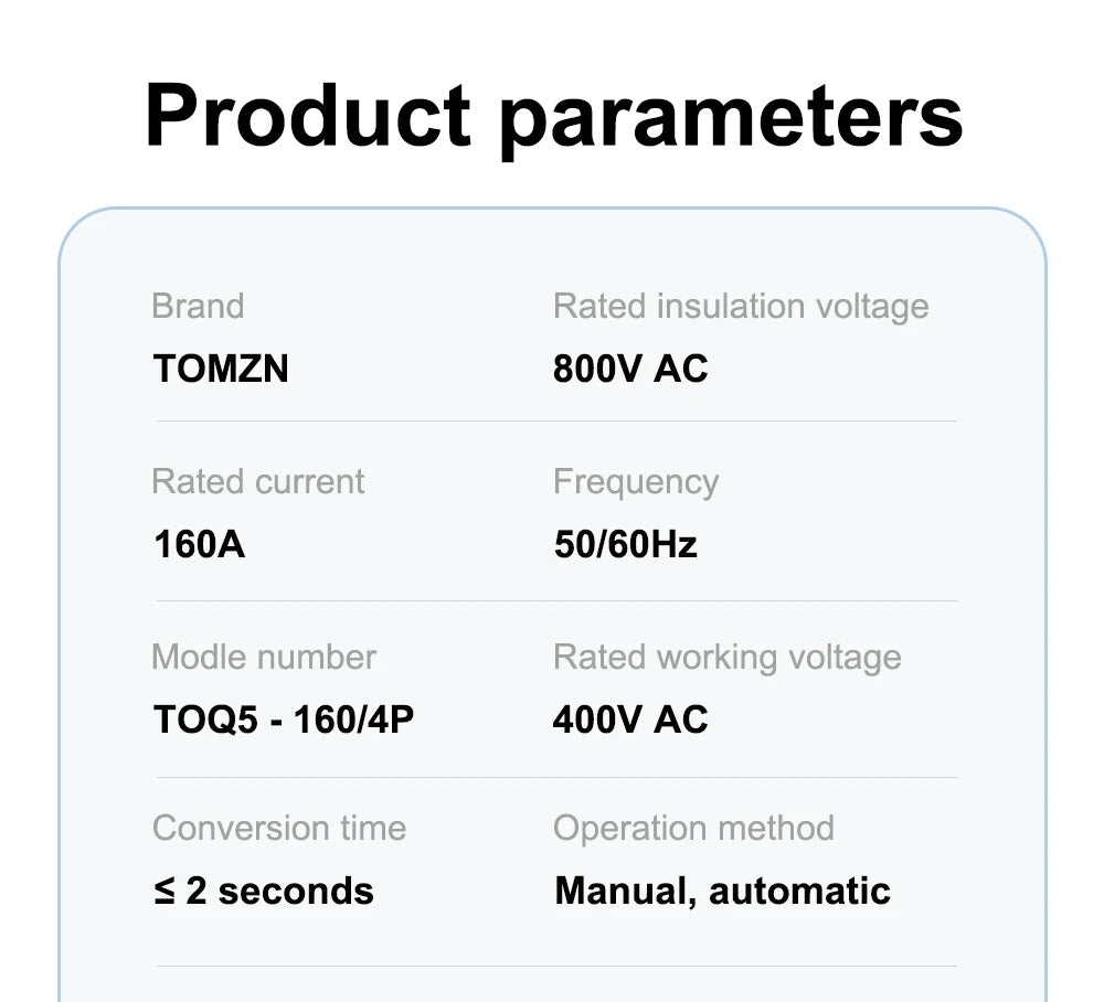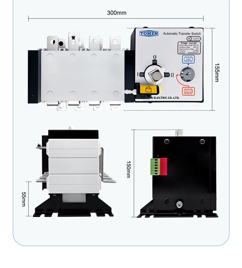 The Tomzn TOQ5-160/4P Handle Type Automatic Transfer Switch is built for high-load applications requiring fast and reliable power source switching between main and backup supplies. With a 160A rating and 4-pole 3-phase design, it’s perfect for factories, commercial buildings, and solar or generator-based backup systems.