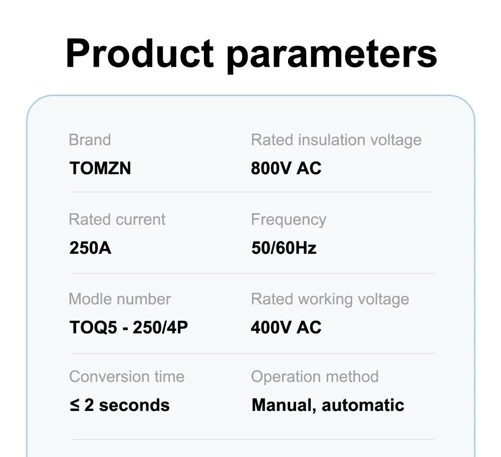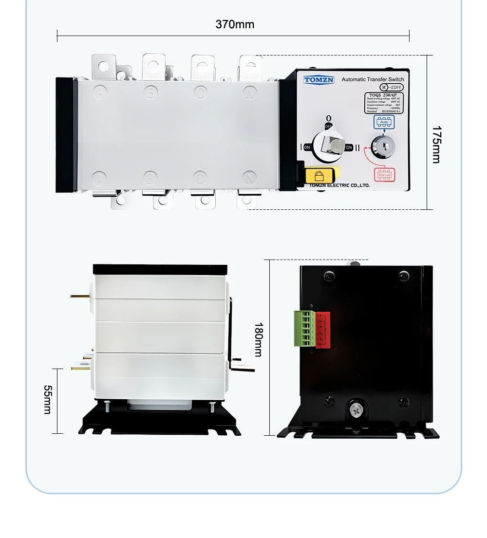 The Tomzn TOQ5-250/4P Handle Type Automatic Transfer Switch is a robust 4-pole ATS designed to manage seamless switching between two AC power sources in high-load three-phase systems. With a rated current capacity of 250A, it is ideal for commercial, industrial, and large residential backup applications.